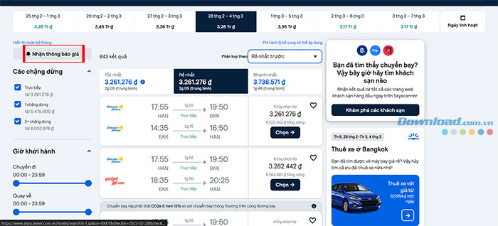 Nếu không có kế hoạch đặt vé ngay, người dùng có thể thiết lập cảnh báo bằng cách nhấp vào Nhận thông báo giá phía trên kết quả tìm kiếm của mình. Người dùng sẽ được yêu cầu đăng nhập và sau đó sẽ nhận được email về bất kỳ biến động nào về giá. Điều này hữu ích nếu chuyến đi của mọi người vẫn còn lâu mới diễn ra hoặc muốn chắc chắn rằng mình đang nhận được một ưu đãi tốt.