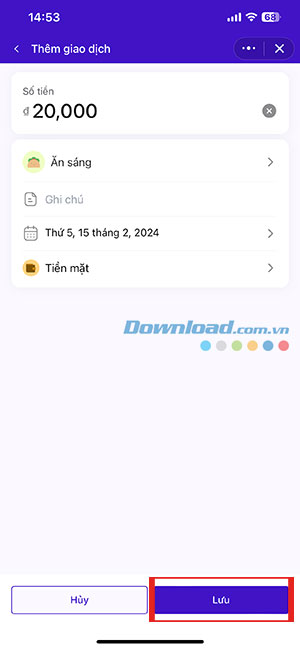 Người dùng có thể Ghi chú và thời gian giao dịch diễn ra để theo sát thu chi của mình. Sau khi đã nhập đủ thông tin chi tiêu, mọi người cần nhấn nút Lưu để thêm giao dịch.