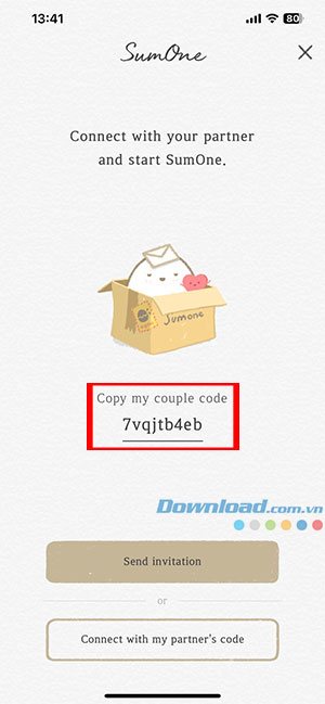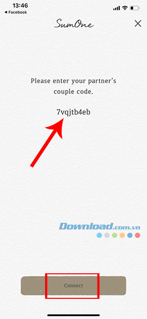 Bước 6: Đối với người còn lại, sau khi tải ứng dụng và thiết lập thông tin cá nhân, hãy nhấn vào Connect with my partner’s code và nhập mã mời từ người kia. Cuối cùng, ấn nút Connect.
