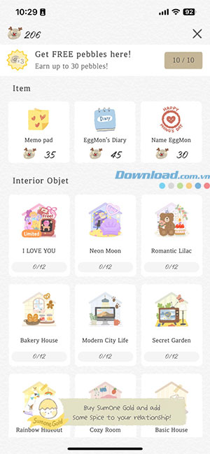 Mỗi ngày truy cập ứng dụng, người dùng có thể nhận được những viên sỏi (tiền tệ trong SumOne) để mua nhiều vật phẩm khác nhau để trang trí căn phòng của EggMon bé nhỏ với các chủ đề khác nhau có sẵn.