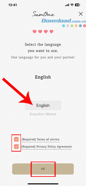 Bước 4: Lựa chọn ngôn ngữ và tích vào Terms of service và Privacy Policy Agreement để chấp nhận điều kiện, điều khoản ứng dụng. Sau đó, ấn nút OK.