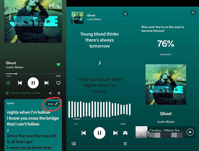 Trước đó, Spotify chỉ cung cấp phần lời bát cho phép người dùng hát theo. Tuy nhiên với tính năng mới này, sau khi hoàn thành một bài hát, mọi người sẽ được ứng dụng chấm điểm và nhận xét như một phần mềm karaoke chuyên nghiệp. Mọi người có thể thử tài ca hát của mình cùng với bạn bè, người thân bất kỳ lúc nào mà không cần tới các thiết bị karaoke chuyên dụng.