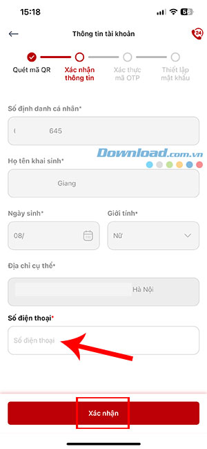 Bước 6: Các thông tin cá nhân của người dùng sẽ được tự động điền sau khi quét mã QR trên CCCD. Người dùng cần nhập số điện thoại và nhấn Xác nhận để hoàn thành thông tin cá nhân.