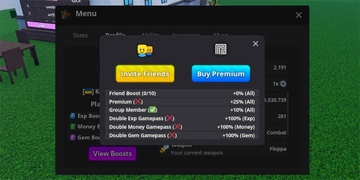 Meme Sea có nhiều loại booster có thể tăng số tiền và XP người chơi nhận được lên 10-100% như Player Boost, Friend Boost và Meme Sea Roblox Group Boost. Để kích hoạt vĩnh viễn, người chơi chỉ cần tham gia Meme Sea Roblox Group.