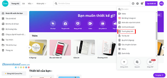 Bước 3: Một menu sẽ mở ra, hãy chọn Tranh ghép ảnh. Sau khi nhấn vào Tranh ghép ảnh, nó sẽ đưa mọi người đến một tab mới với các danh mục cắt ghép ảnh và bảng thiết kế.