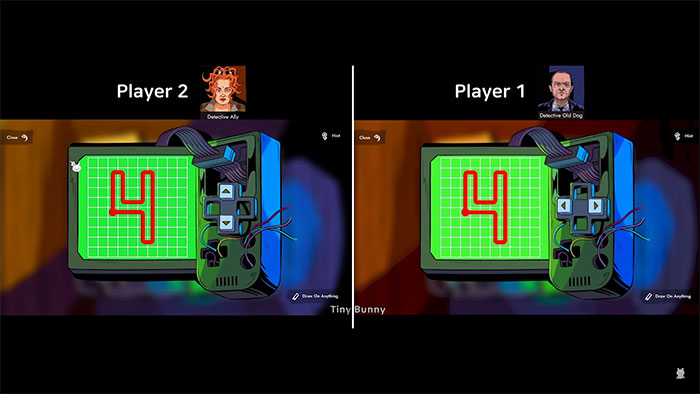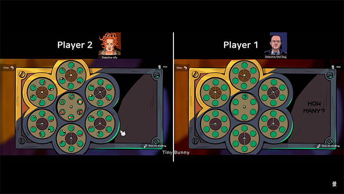 Đối với Old Dog, hãy xoay nút xoay ở giữa để biểu tượng game-pad ở trên cùng. Đối với Ally, hãy xoay nút xoay ở giữa sao cho nút thắt ở trên cùng. Sau khi hoàn thành cả hai câu đố, phía Old Dog sẽ hiển thị ? nơi Ally thể hiện nút thắt. Đếm số nút thắt trong hộp của cả hai người chơi để có được số 5.
