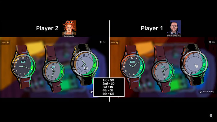 Ally có một nhóm gồm 3 chiếc đồng hồ và Old Dog có 2 chiếc đồng hồ, một mặt số có chữ cái trên đó. Nhìn vào kim giờ và kim phút trên mỗi chiếc đồng hồ (đồng hồ được đánh số từ 1-5) và nhìn vào các chữ cái tương ứng: