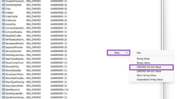Bước 3: Nhấp chuột phải vào khoảng trống ở khung bên phải, chọn New > DWORD (32-bit) Value.