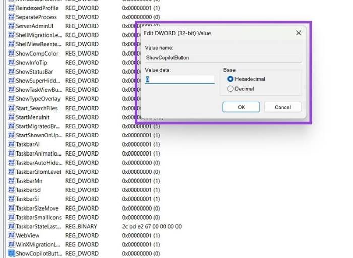 Bước 4: Đặt tên giá trị mới là ShowCopilotButton. Sau đó nhấp đúp vào giá trị này và đặt Value data là 0.
