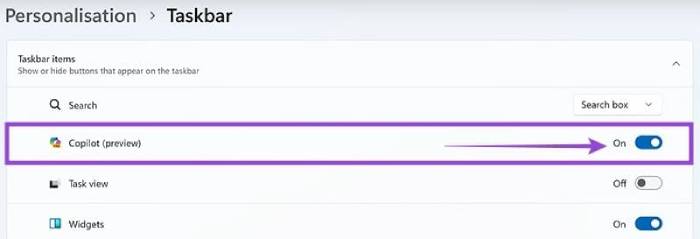 Bước 3: Trong phần Taskbar items, mọi người sẽ thấy tùy chọn Copilot. Gạt nút chuyển sang Off để ẩn biểu tượng này.