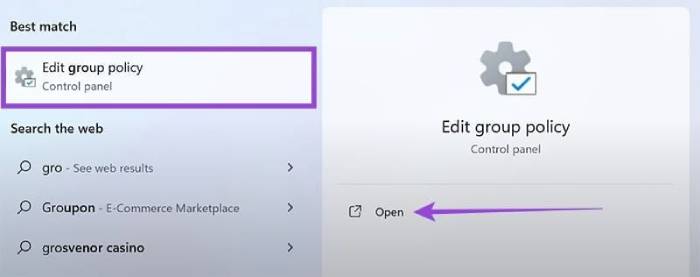 Bước 1: Mở Group Policy Editor bằng cách tìm kiếm Group Policy trong thanh tìm kiếm của Windows.