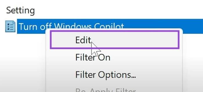 Bước 3: Tìm và chọn thiết lập Turn off Windows Copilot, sau đó nhấn chuột phải và chọn Edit.