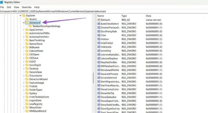 Bước 2: Trong menu bên trái, truy cập đường dẫn sau: HKEY_CURRENT_USER\Software\Microsoft\Windows\CurrentVersion\Explorer\Advanced.