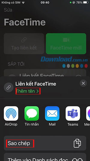 Tiếp tục chọn Thêm tên ở đầu Trang chia sẻ để đặt tên tùy chỉnh cho cuộc gọi FaceTime. Đặt tên giúp dễ dàng phân biệt giữa nhiều cuộc gọi đã lên lịch. Với cuộc gọi được đặt tên, hãy chọn Sao chép từ menu để dán URL cuộc gọi FaceTime vào tin nhắn, mail hoặc bất kỳ ứng dụng nào khác.