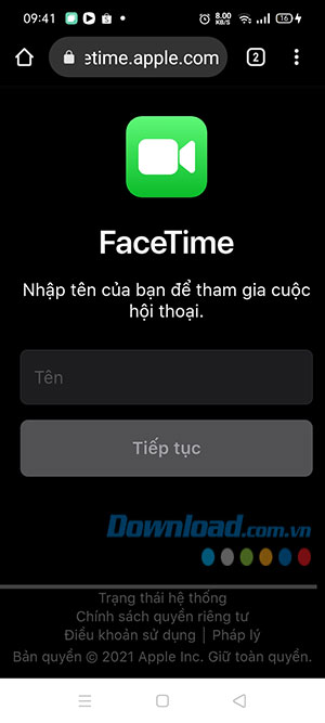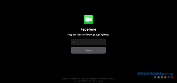 Người dùng Windows cần nhấp vào liên kết cuộc gọi FaceTime đã nhận được từ người dùng Apple. Sau khi vào liên kết, nhập tên và nhấn nút Tiếp tục.