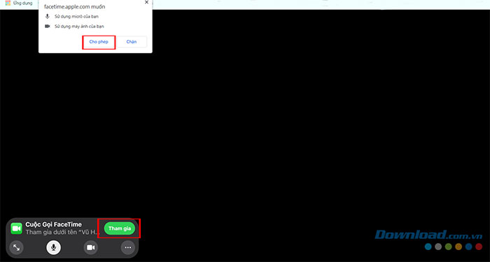 Khi chuyển sang giao diện cuộc gọi FaceTime, nó sẽ yêu cầu quyền truy cập micro, chọn Cho phép để cấp quyền. Tiếp tục nhấn vào Tham gia để gửi yêu cầu tham gia FaceTime cho người dùng Apple.