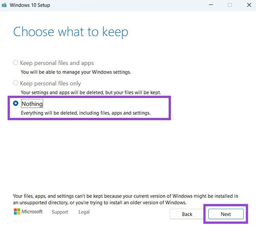 Bước 5: Chấp nhận điều khoản một lần nữa để điều hướng tới trang Choose what to keep. Lúc này, mọi người không thể giữ lại bất cứ dữ liệu hay ứng dụng nào, nên để nguyên ở chế độ Nothing rồi nhấn Next.