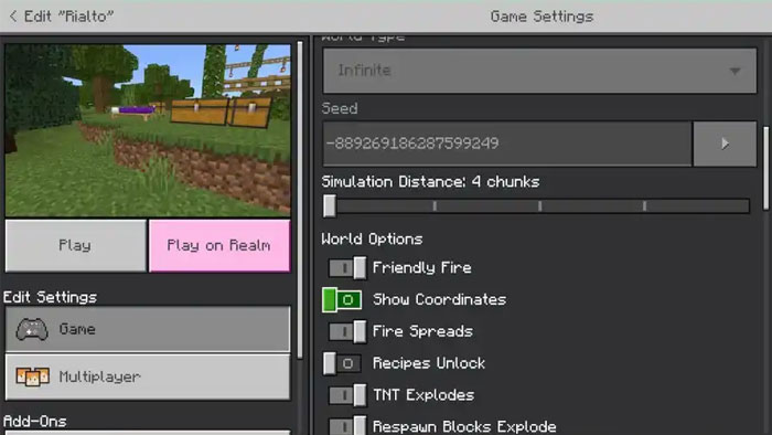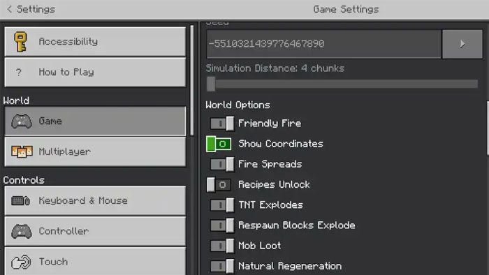 Khi công tắc ở phía bên phải của mục Show Coordinates chuyển sang màu xanh lá cây, tọa độ đã được bật cho thế giới đó.