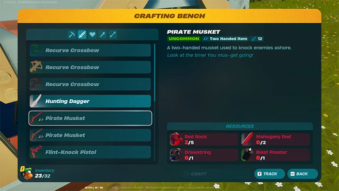 Đây là một trong những nhiệm vụ dễ thực hiện nhất trong LEGO Pass mới trong LEGO Fortnite. Sau khi thu thập được bất kỳ vật liệu mới nào, game thủ sẽ mở khóa được công thức chế tạo vũ khí này. Mọi người có thể chế tạo bất kỳ vũ khí nào để hoàn thành nhiệm vụ. Lựa chọn tốt nhất là Pistol vì nó chỉ cần một tay, trái ngược với Musket.