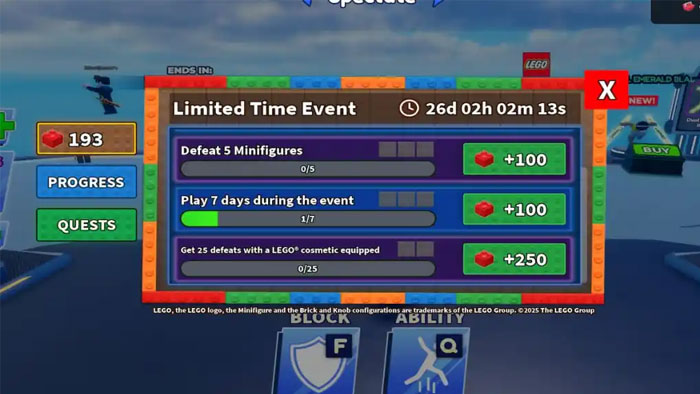 Không giống như sự kiện Fisch x LEGO, sự kiện LEGO trong Blade Ball khá đơn giản. Tất cả những gì người chơi cần làm là thu thập các viên gạch LEGO bằng cách hoàn thành nhiều nhiệm vụ khác nhau. Sau đó, dựa trên số lượng gạch LEGO thu thập được, người chơi sẽ mở khóa phần thưởng theo kiểu battle pass.