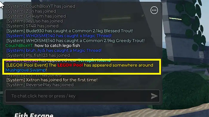 Hồ LEGO thường xuất hiện gần bờ biển Mushgrove Swamp, nên mọi người cũng có thể ưu tiên kiểm tra khu vực đó nếu chờ lâu mà chưa thấy thông báo. Sau khi tìm thấy Hồ LEGO, hãy sử dụng Brick Built Rod để câu cá trong khu vực đó.