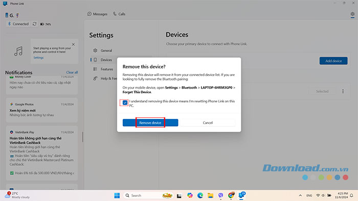 Bước 3: Tích chọn ô vuông I understand removing this device means I’m resetting Phone Link on this PC và nhấn nút Remove device.