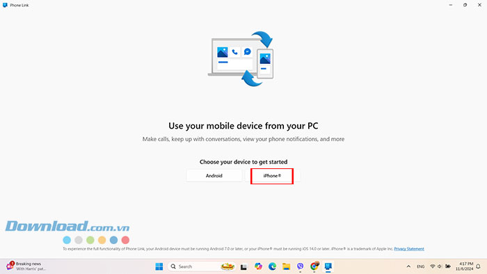 Bước 3: Sau khi mở ứng dụng Phone Link, hãy chọn thiết bị Android hoặc iOS.