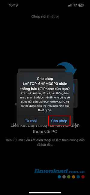 Bước 7: Nhấn Cho phép trên điện thoại để cấp quyền nhận thông báo, cuộc gọi,... từ thiết bị tới máy tính.