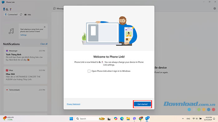 Bước 9: Khi điện thoại và máy tính chạy Windows đã kết nối thành công nhấn Get Started.