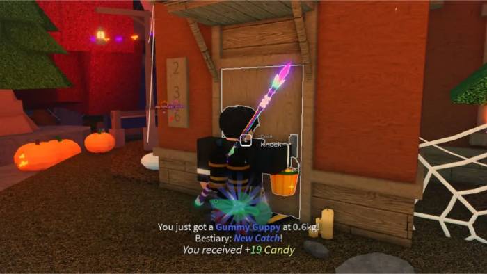 Một NPC sẽ mở cửa và nói Trick or Treat. Dù chọn cách nào, người chơi vẫn sẽ nhận được Candy. Đôi khi mọi người còn có thể may mắn nhận được cá hiếm giới hạn thời gian từ danh mục sinh vật mới.