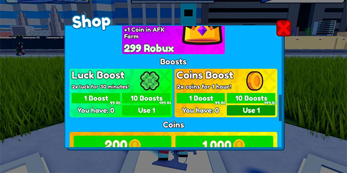 Ngoài ra, người chơi có thể sử dụng Coins Boosts để tăng thu nhập, có sẵn trong tab Shop. Mỗi boost cung cấp hệ số nhân kiếm tiền xu gấp đôi trong một giờ. Thông thường, những booster này được phân phối miễn phí trong quá trình cập nhật trò chơi hoặc có thể mua bằng Robux: