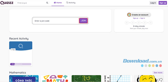 Ngoài những bài tập giáo viên giao, học sinh có thể củng cố thêm kiến thức của mình bằng cách tìm và làm các bài tập được những người dùng khác tạo trên Quizizz. Quizizz có tất cả những môn học sinh cần như Toán, Tiếng Anh, Lịch sử,... thậm chí cả môn học chuyên ngành cho sinh viên như Marketing, Nghệ thuật, Công nghệ thông tin,... Làm theo các bước sau đây để tham gia bài tập có sẵn trên Quizizz: