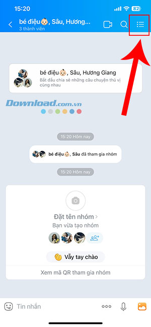 Bước 2: Trong giao diện cuộc trò chuyện nhóm, nhấn vào biểu tượng ba dấu gạch ngang ở góc trên cùng bên phải.