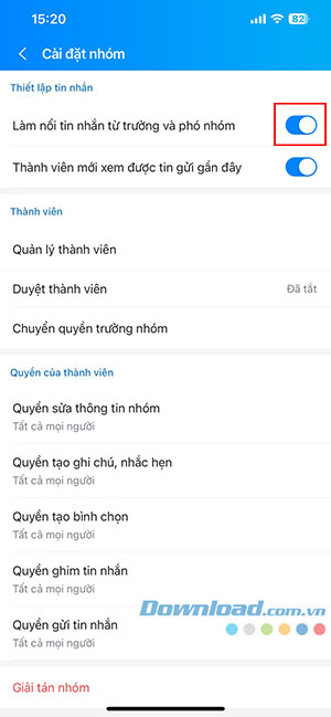 Bước 4: Tại trang Cài đặt nhóm, trong mục Thiết lập tin nhắn, chạm vào công tắc chuyển đổi để bật Làm nổi tin nhắn từ trưởng và phó nhóm.