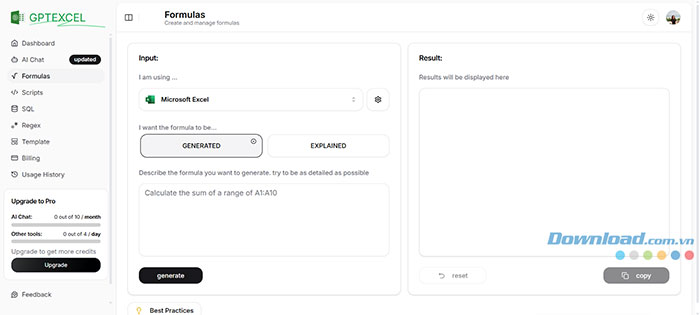 Nhấn nút Generate (Tạo) để khởi động quá trình tạo công thức bằng AI. AI sẽ phân tích mô tả của người dùng và tạo ra công thức phù hợp. Quá trình này thường chỉ mất vài giây, tùy theo độ phức tạp của công thức. Sau khi được tạo, công thức sẽ hiển thị rõ ràng bên dưới ô nhập.