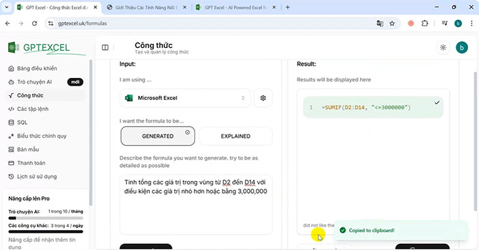 Chọn công thức được tạo ra và sao chép vào clipboard. Sau đó, dán công thức vào ô phù hợp trong bảng tính Excel hoặc Google Sheets. Đảm bảo các tham chiếu ô chính xác và điều chỉnh nếu cần để phù hợp với bố cục dữ liệu của mình.