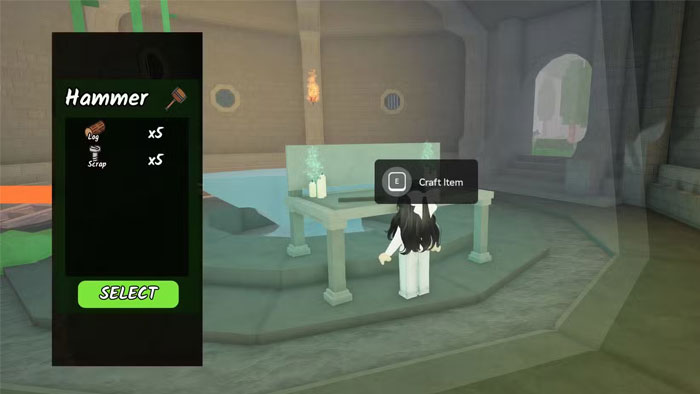 Sau đó, đến bàn chế tạo bên hông, chọn công thức búa và đặt 5 Logs + 5 Scrap lên đe. Các nguyên liệu này có thể tìm được bằng cách: