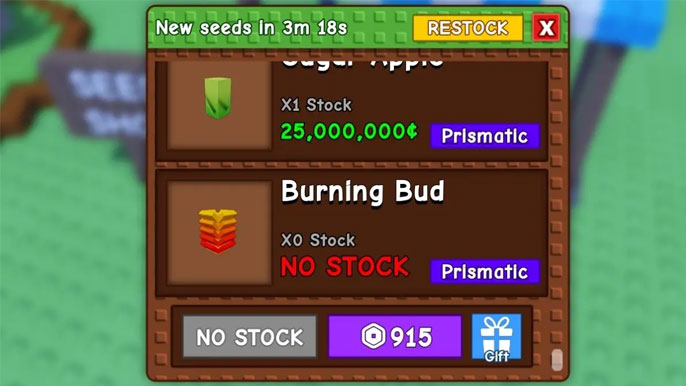 Hãy đợi trái cây trong vườn tích tụ nhiều đột biến, sau đó thu hoạch số lượng lớn và chúng cùng lúc để kiếm tiền nhanh. Seed Shop sẽ làm mới mỗi 5 phút, nhưng vì Burning Bud có tỉ lệ xuất hiện cực thấp, game thủ có thể sẽ phải chờ rất lâu trong server để thấy nó xuất hiện.