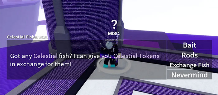 Câu cá ở Blox Fruits là một trong những cách tốt nhất để tìm Celestial Token. Đầu tiên, người chơi phải lấy một cần câu Shell và đến gặp Celestial Fisherman. Sau đó, hãy yểm bùa cần câu bằng Celestial bằng cách đưa cho NPC này Celestial Fish. Cuối cùng, câu cá ở đó và đổi vật phẩm lấy 10 Celestial Token với NPC.