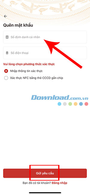 Bước 2: Trong giao diện Quên mật khẩu, nhập Số định danh cá nhân và Số điện thoại của mình. Sau đó chọn 1 trong 2 phương thức xác thực là Nhập thông tin xác thực hoặc Xác thực bằng NFC bằng thẻ CCCD gắn chip. Tiếp tục nhấn Gửi yêu cầu.