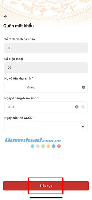 Bước 3: Hoàn thiện thông tin cá nhân bao gồm Họ và tên khai sinh, Ngày tháng năm sinh và Ngày cấp thẻ CCCD. Sau đó nhấn vào Tiếp tục.