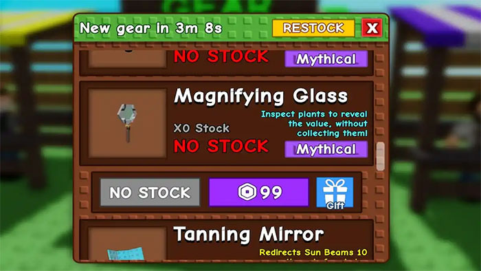 Cuộn xuống một chút, người chơi sẽ thấy Magnifying Glass nằm ngay dưới Godly Sprinkler, có giá là 10.000.000 Sheckles hoặc 99 Robux.