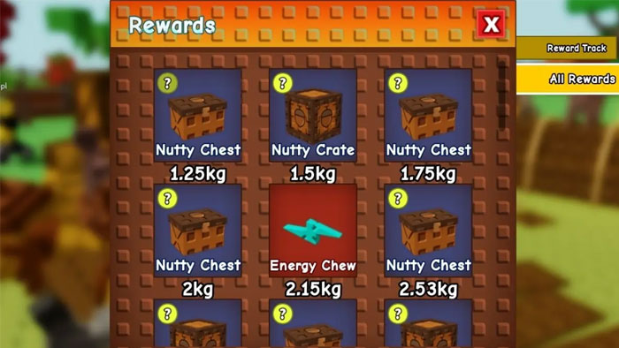 Trong các phần thưởng này, Nutty Chest sẽ xuất hiện ở một số mốc nhất định, cùng với các thùng đồ, công cụ và phần thưởng khác.