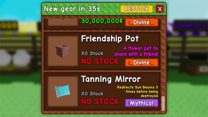 Người chơi có thể mua Tanning Mirror tại Gear Shop với giá 1.000.000 Sheckles. Hãy sử dụng Recall Wrench hoặc chỉ cần đi đến quầy hàng, tương tác với NPC Eloise và yêu cầu danh mục đồ dùng. Khi cuộn xuống danh sách, mọi người sẽ thấy Tanning Mirror là một vật phẩm Mythical trong trò chơi.