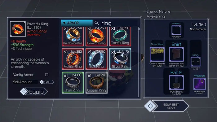 | Powerful Ring | Health: +0 Strength: +59.6 Technique: +0 |