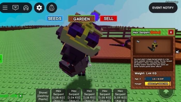 Sau khi đã có Hex Circle, hãy trồng 5 cây đơn bên trong vòng tròn. Cứ mỗi 12 phút, Hex Serpent sẽ thực hiện nghi lễ nuốt chửng các cây trồng và trao cho người chơi phần thưởng Halloween đặc biệt, kèm theo đột biến Vamp cho cây trồng.