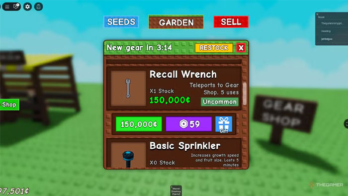 Khi đã đến được Gear Shop, hãy tương tác với NPC để mở menu mua hàng. Tại đây, người chơi sẽ thấy Recall Wrench có giá 150.000 đô la trong game, hoặc có thể mua bằng 59 Robux. Ngoài ra, game thủ còn có tùy chọn tặng vật phẩm này cho người chơi khác.