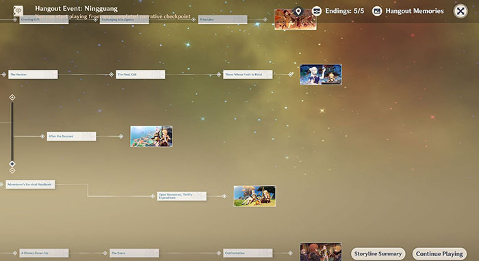 Mỗi nhân vật có 5 hoặc 6 kết thúc khác nhau cho các sự kiện của họ, tùy thuộc vào lựa chọn của người chơi. Để thu thập các phần thưởng (bao gồm điểm kinh nghiệm nhân vật, thức ăn và Nguyên thạch Primogem), game thủ cần mở khóa tất cả kết thúc. Hangout Event sẽ không bị khóa sau bất kỳ cổng thời gian nào, vì vậy người chơi có thể dành thời gian bất cứ khi nào để thực hiện chúng.