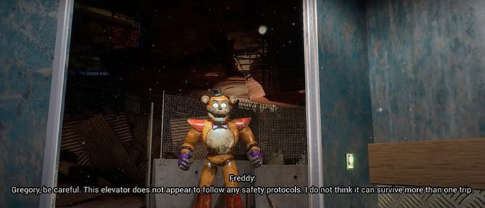 Sau đó, đi xuống và vào bên trong Freddy. Gregory sẽ phá vỡ xích của một hàng rào dẫn vào lòng đất. Tiếp tục đi hết con đường cuối cùng và mở thang máy với hai ngọn đèn bên cạnh. Một đoạn cắt cảnh Freddy nói với Gregory rằng thang máy không an toàn sẽ xuất hiện.