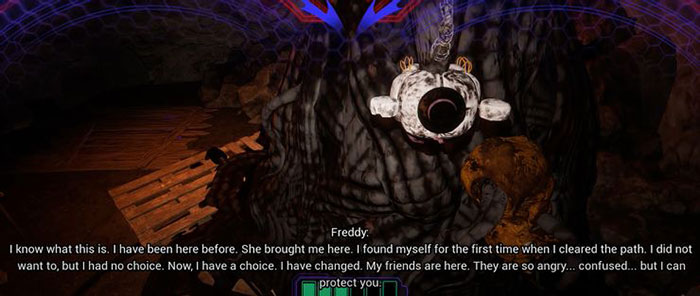 Khi ở phía dưới, sẽ có một hành lang dài rộng mở với nhiều máy phát điện màu tím, người chơi sẽ phải bật khi đi đến cuối. Tiếp tục cho đến khi chạm biển Freddy's Fazbear's Pizza Place. Sau đó, vào bên trong Freddy và đi sâu hơn vào cái hố khổng lồ trên mặt đất. Ở phía dưới, sẽ có một sinh vật khổng lồ đang ngủ, và người chơi cần rơi qua mặt đất.